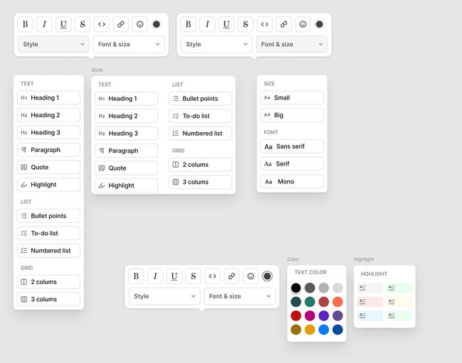 The user can apply formatting such as bold, italic, underline, headings, lists, text color, highlight color, font size, and other available style options.